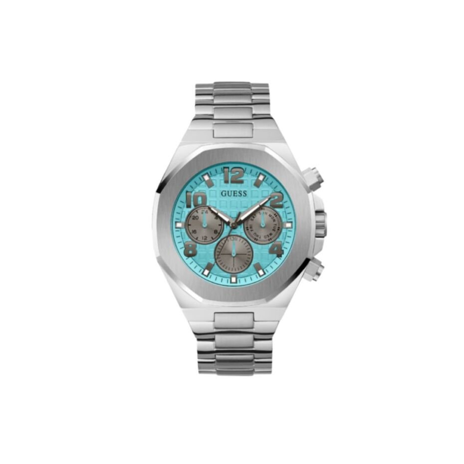 Guess Mens Silver Stainless Steel Case Blue Dial With Day-Date Silver Tone Stainless Steel Bracelet Watch